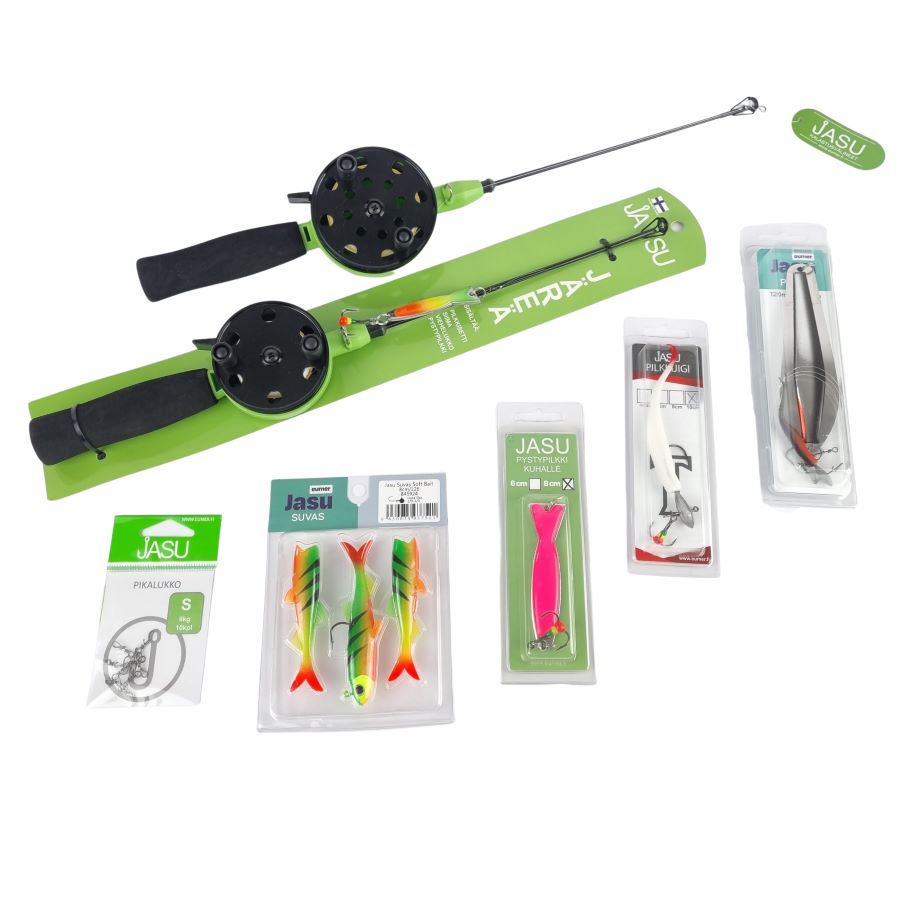 Järeä means sturdy so this kit makes it possible to ice fish for even those little bit heavier fish. Perfect for zander, rainbow trout and giant perch. We wanted to make it easier for you to buy ice fishing equipment so we made these kits that include everything you need for ice fishing after you have made a fishing hole in the ice. This kit even includes double rods so you can take a friend along or make yourself two ice fishing combos that you can switch between in a flash if needed. And because so many people have been asking what kind of knot should they use and how to tie the correct one, we made them already for you. With this kit you can really start fishing as soon as you have drilled that fishing hole. The reel is lockable and is released by pressing the lever. The reel also has a ratchet that will make sound when a bigger fish starts to take the line.
