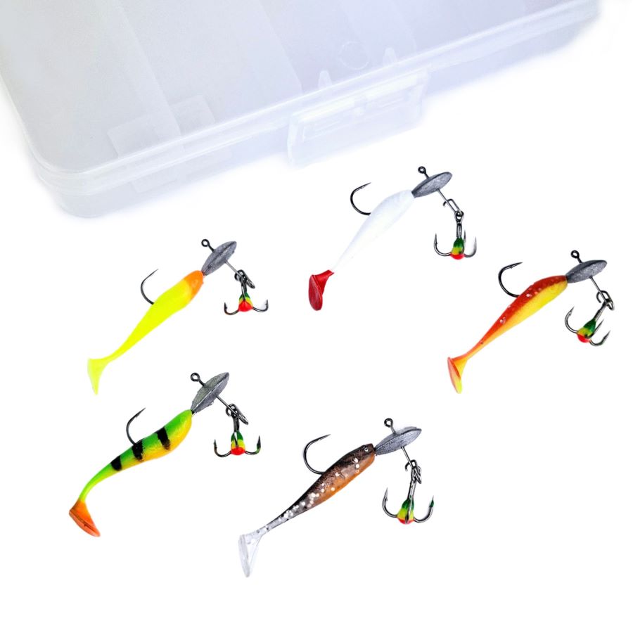 Now it's possible to purchase these Jasu Louhi Ice Fishing Jigs as a kit. Kit includes 5 pcs Louhi Ice Fishing Jigs and a handy box. Louhi Ice Fishing Jig is very effective on ice fishing for every fish that eats small baitfish. They include jig head, jig that imitates a fleeing small baitfish and colour hook. Soft material and tail with very strong swimming action makes jigs body vibrate attractively even when it's swimming very slowly. By jerking the ice fish rod the jig will swim like a fleeing baitfish. Sometimes you should only vibrate the rod slightly or keep jig still. You should vary the fishing depth and technique for best results. Especially effective for perch, zander, rainbow trout, grayling and whitefish.