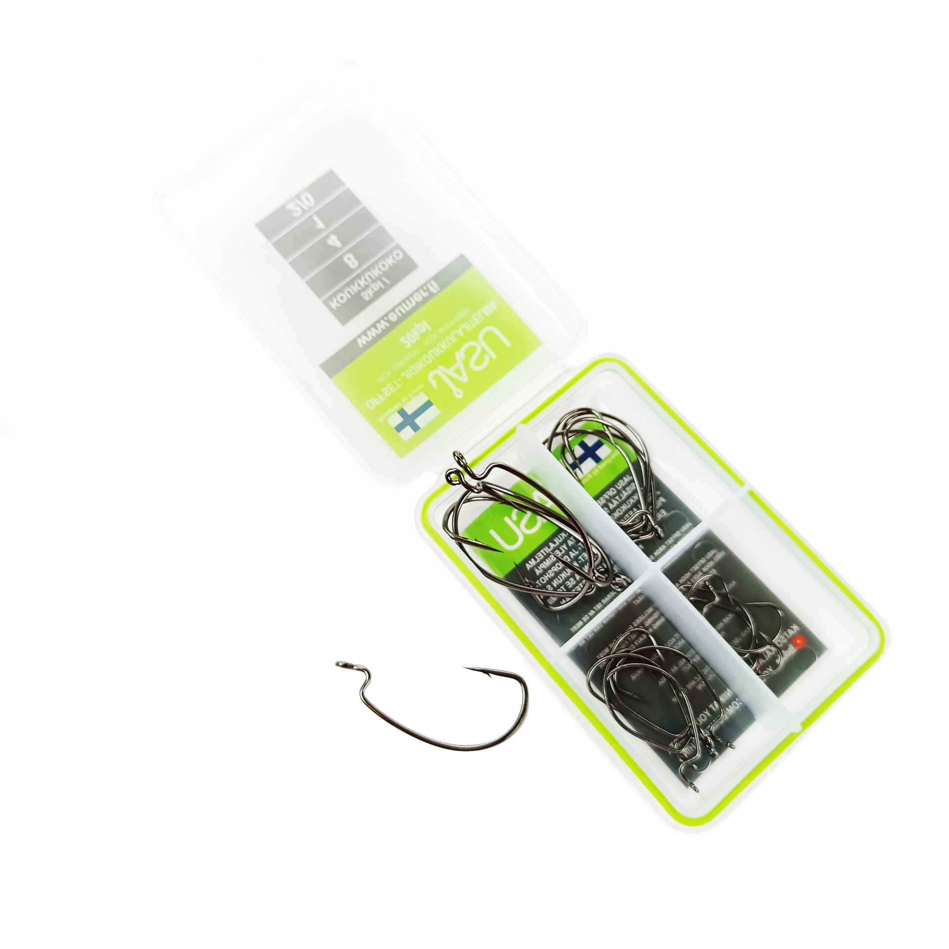 Kit includes 5 most common sizes of offset hooks. Offset hooks are used with quick release jig heads and in Dropshot fishing. Tip of the hook can be hidden inside of the jig so it passes through the weeds easily.
