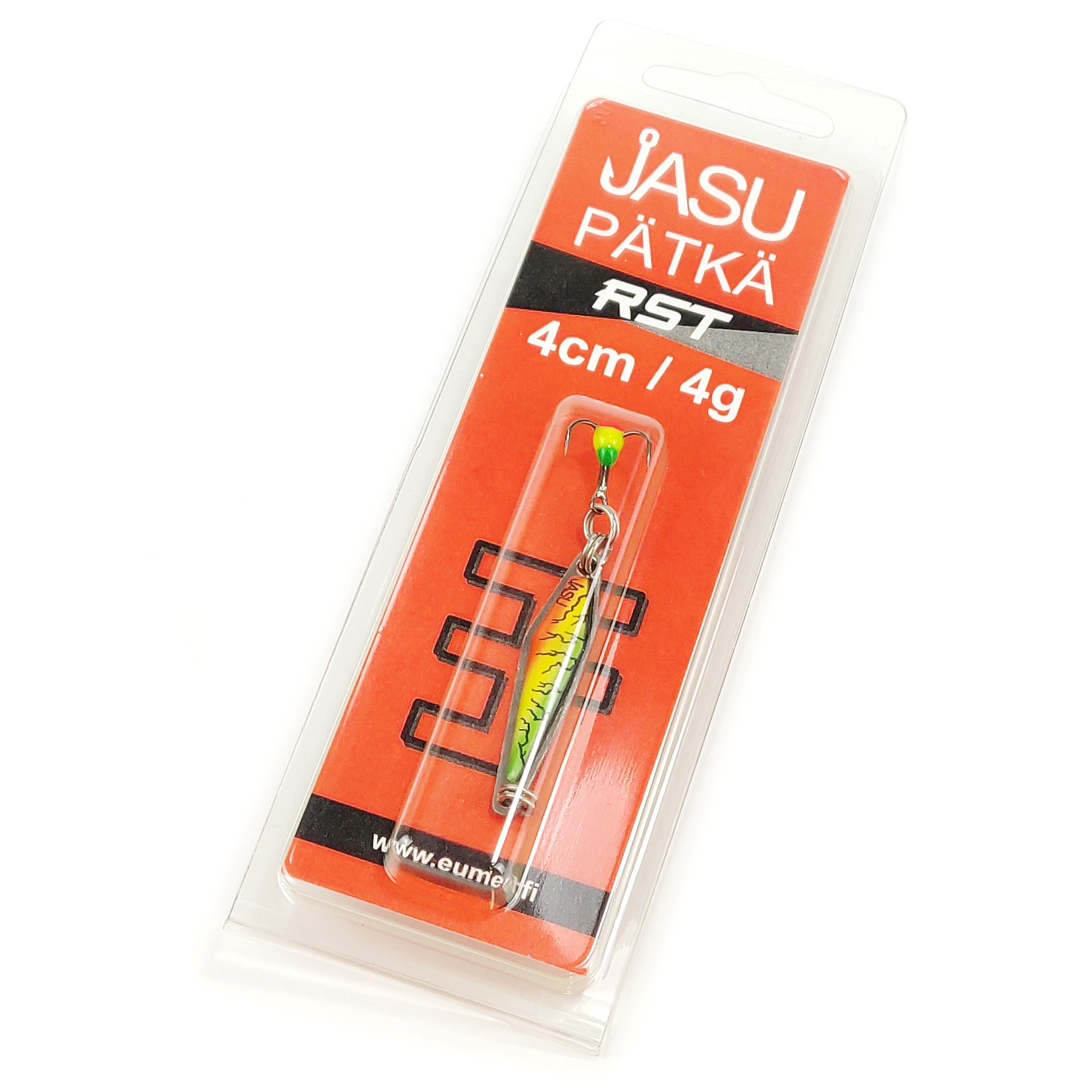 Small but spicy! Jasu Pätkä is made in Satakunta, Finland. It is a combination of a spoon and a vertical ice fishing spoon and can be used for ice fishing but you can also cast it with a spinning rod. So this is very versatile lure and can be used year round. It's especially effective for perch, trout and grayling. It's made of stainless steel and coated with an unbreakable 3D coating. Sharp treble hook is attached with double rings.