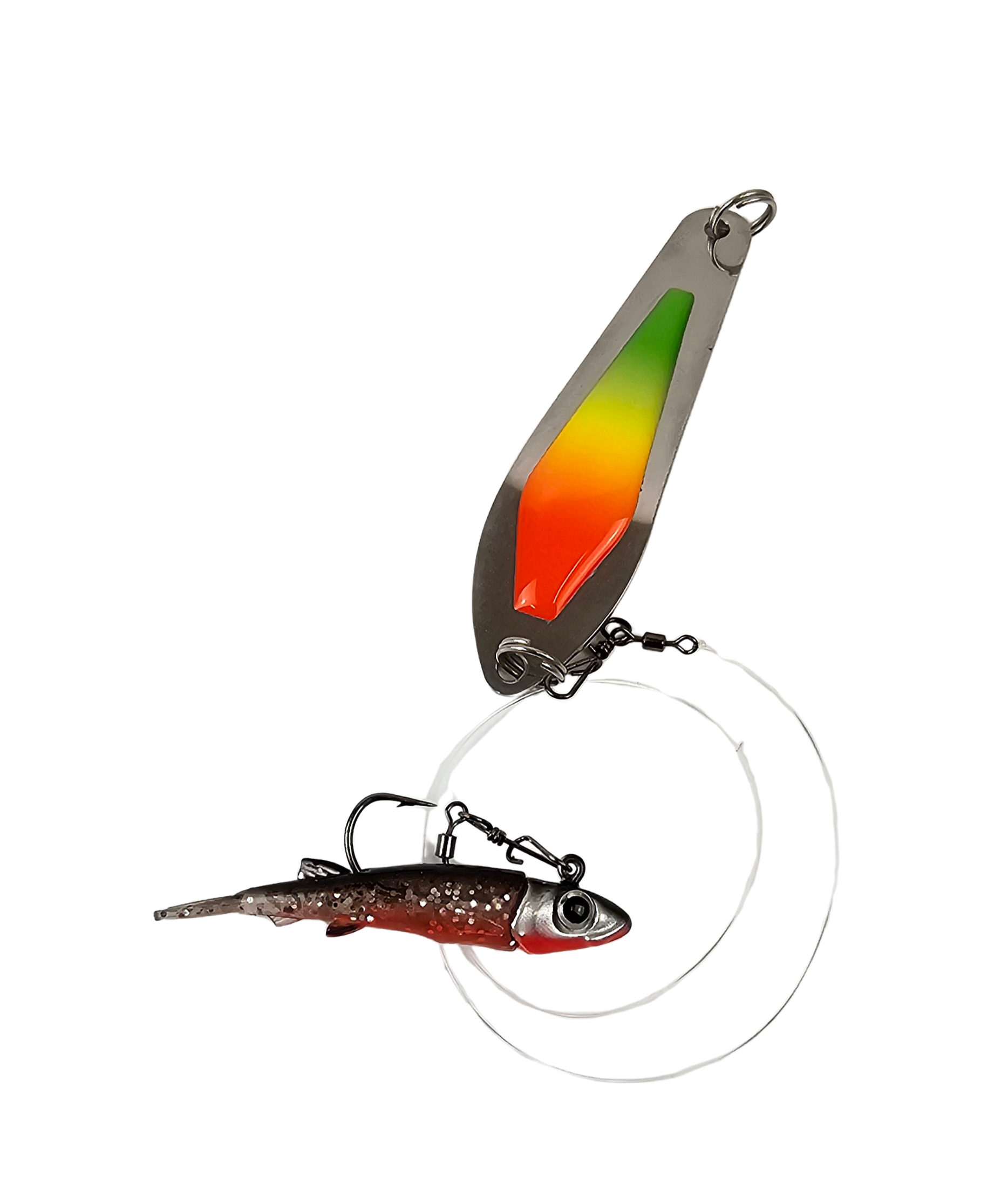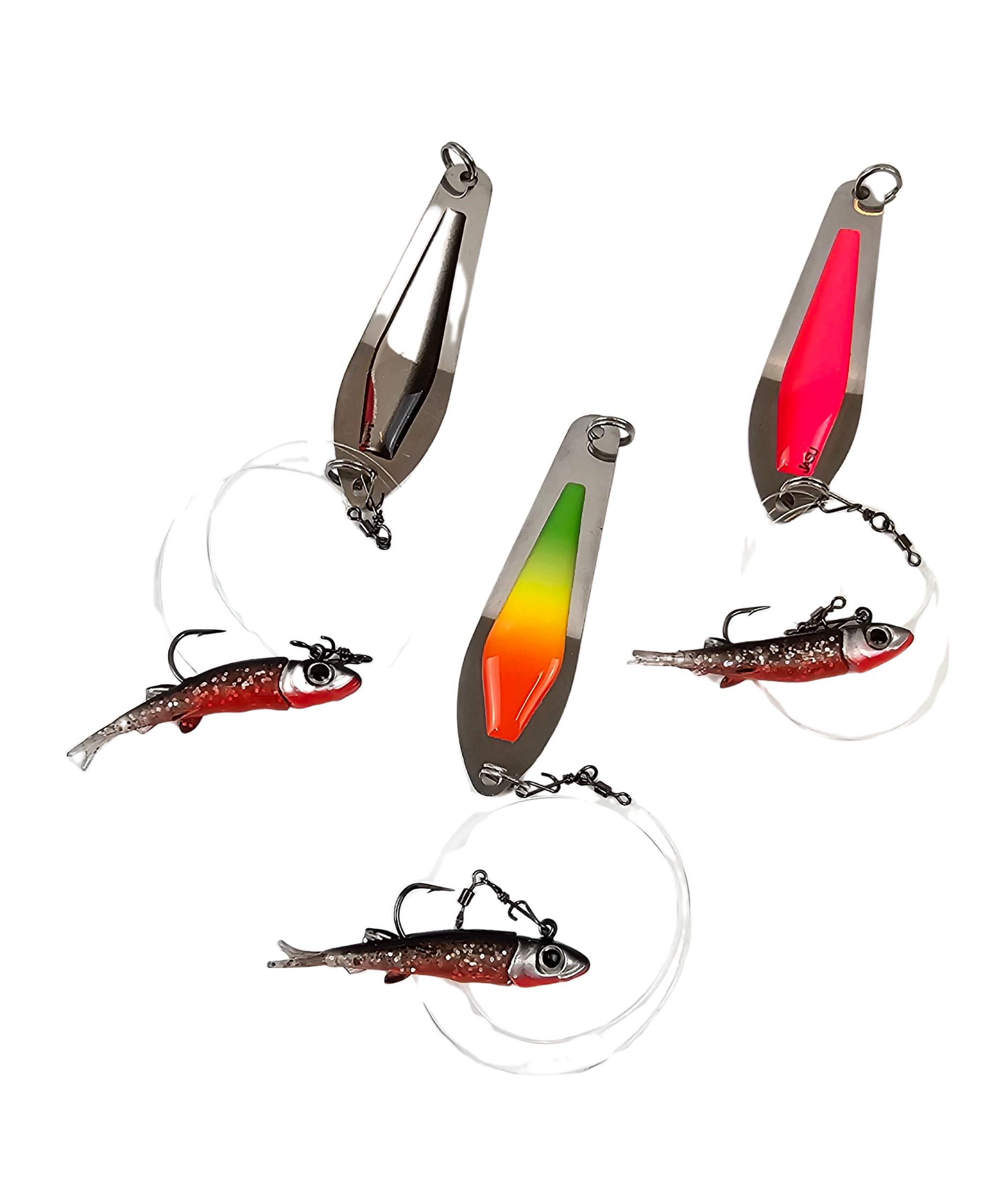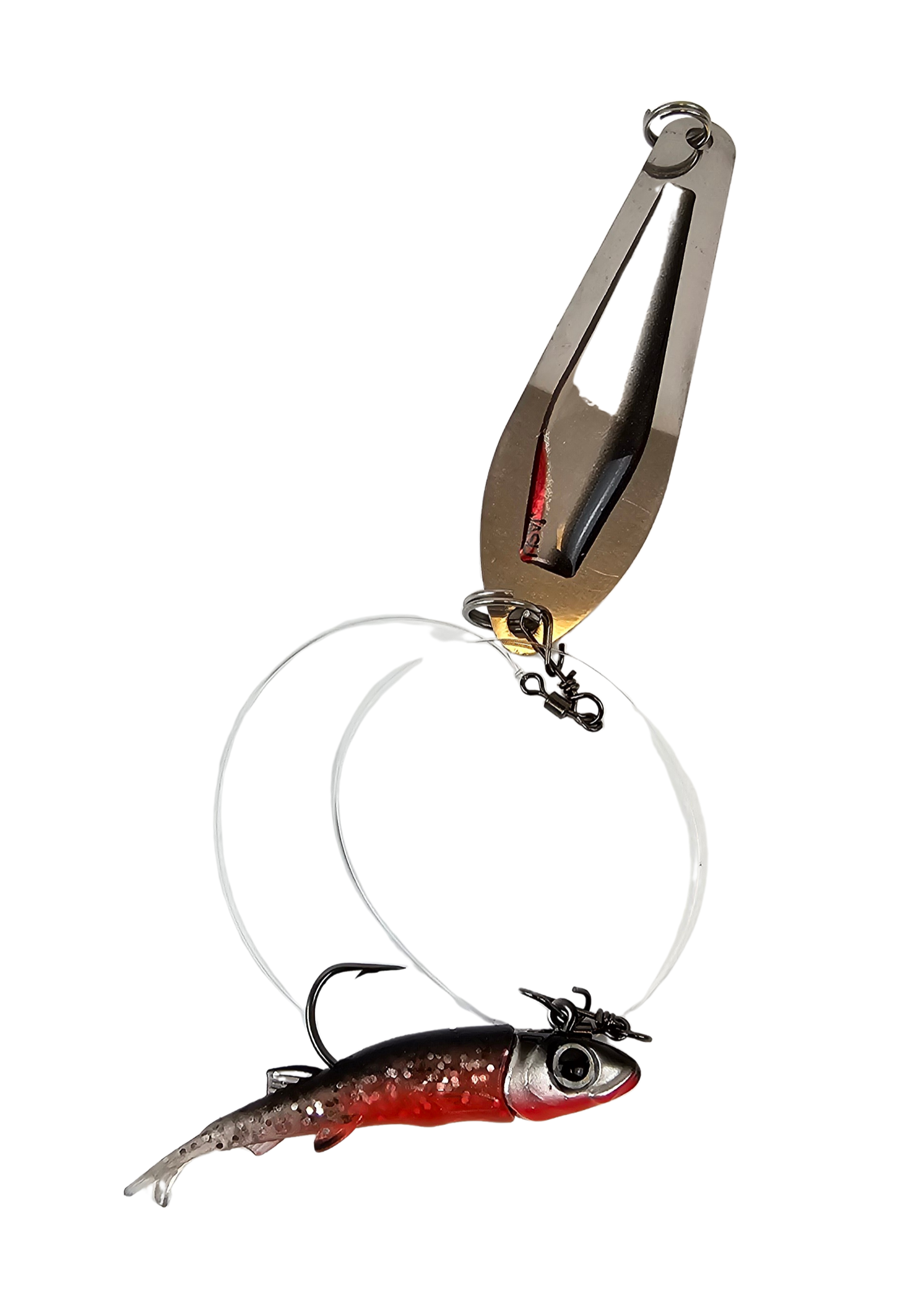 Narrow profiled vertical ice fishing spoon is effective if you want to keep a perch school interested for a longer time. Because it's narrow, it will sink faster so it won't be out of the fish's sight so long. You can use it also with leader so that you can use mormyshkas and flies with it. All Jasu Vertical Ice Fishing Spoons are made in Finland.