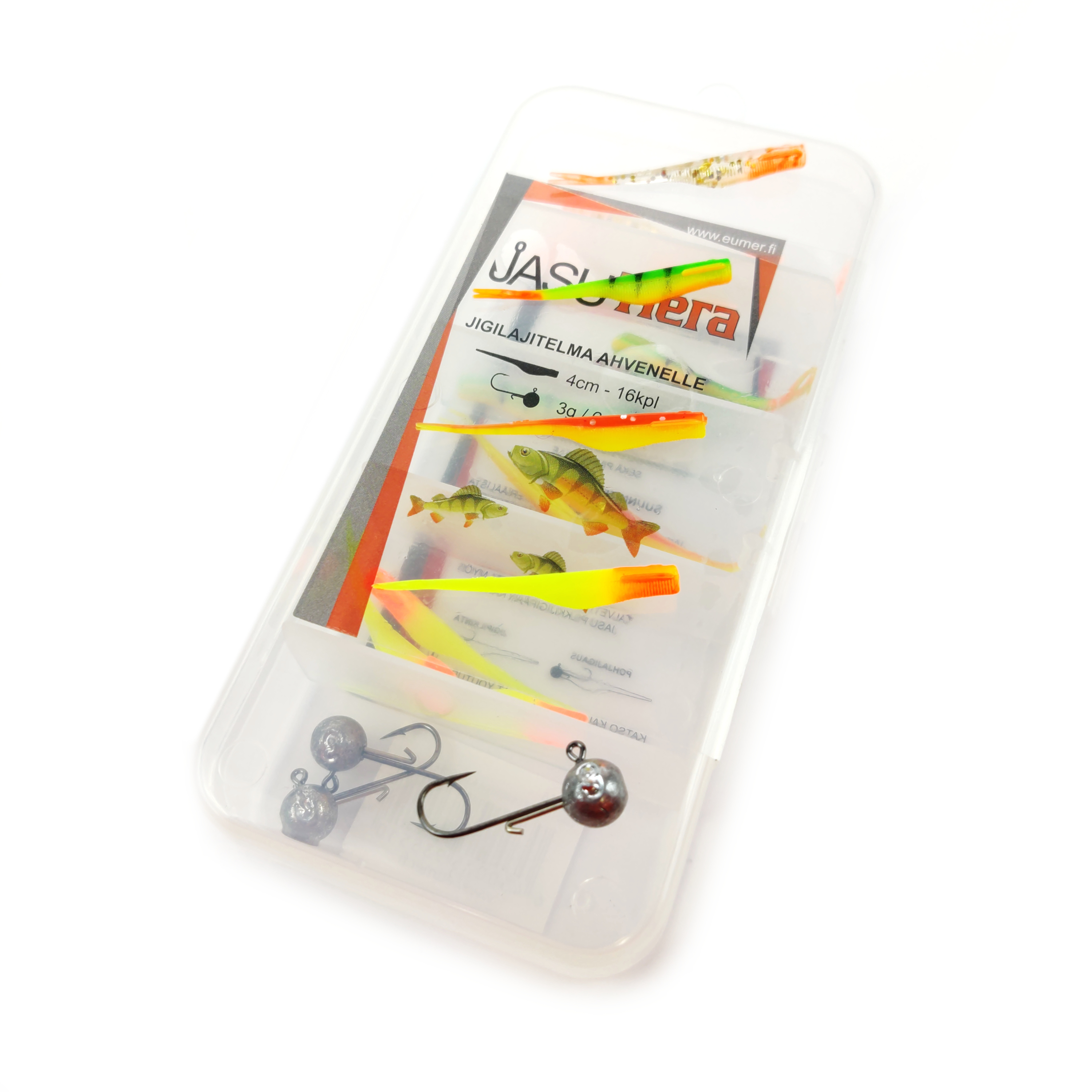 You don't have to figure out what jig head size is correct for your jigs. Our jig kits include jigs and the right size of jig heads for those. Jasu Tiera is made of soft material and shape is resembling a prey fish. Swimming is very sensitive. Wings on sides and V-tail increase catching properties also for ice fishing.