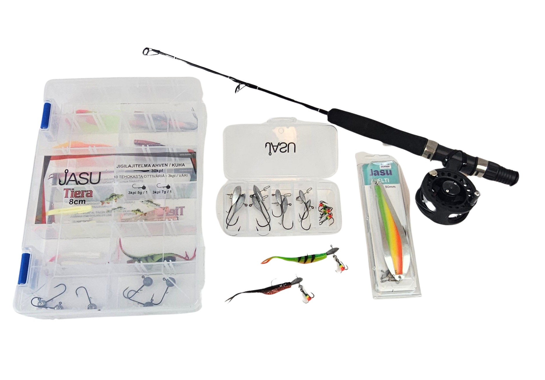 This jig ice fishing kit includes everything necessary for zander ice fishing. Kit includes light and bent aluminum Jasu Pelti Ice Fishing Spoon that will float slowly and give an unexpected swim action for the jig. The flicker and vibration of the aluminum spoon will tempt fish even from long distances and they will bite your attractive jig. Kit includes also very tasty jigs that you can use also without the Pelti Spoon.
