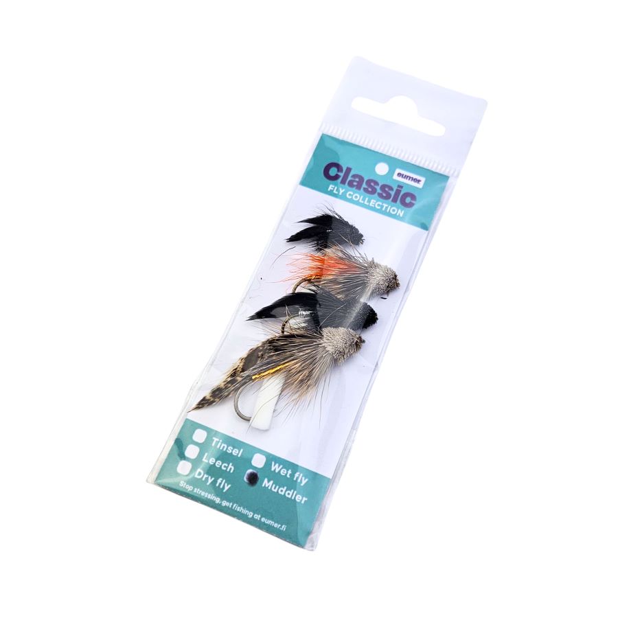 Classic Muddler lajitelma sisältää neljä erilaista Streamer Muddler perhoa. Streamerit toimivat tehokkaasti kirjolohen, taimenen ja harjuksen kalastuksessa. Perhot toimivat hyvin läpi kauden virtaavassa sekä seisovassa vedessä. Erityisen hyviä ne ovat kosken niskoilla ja ns. loppu liu`ussa.