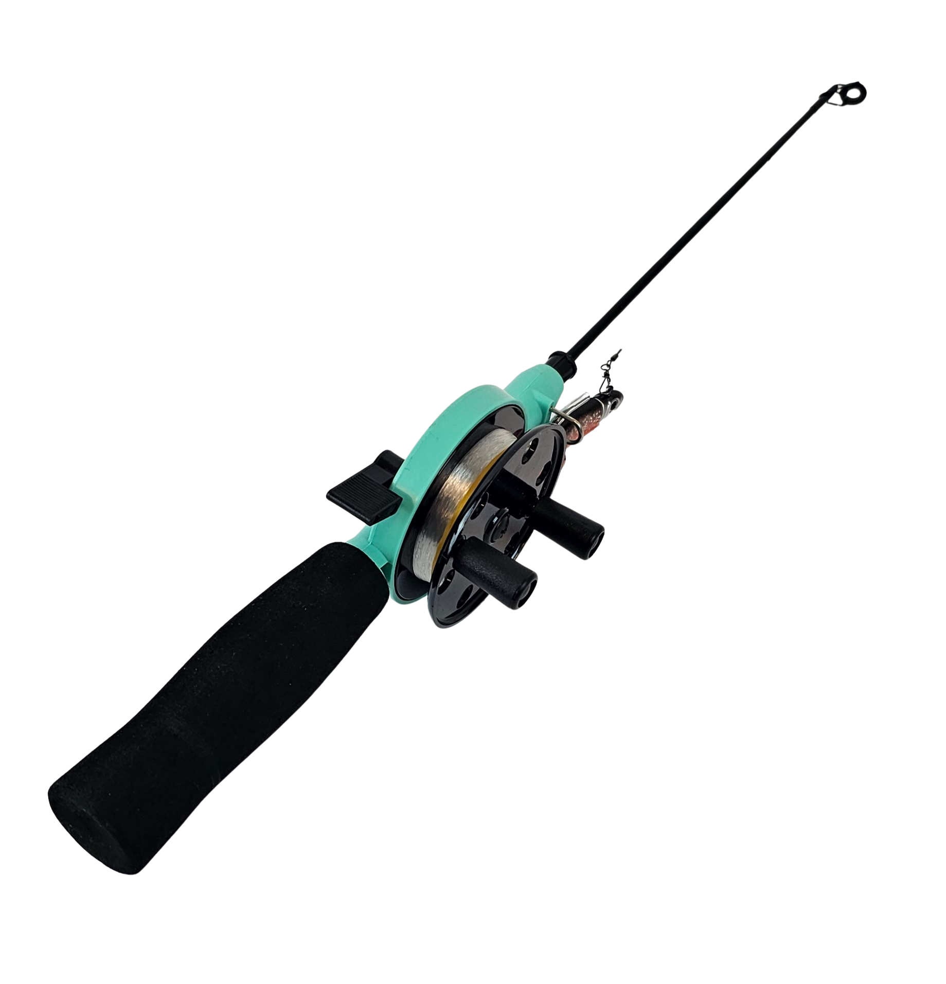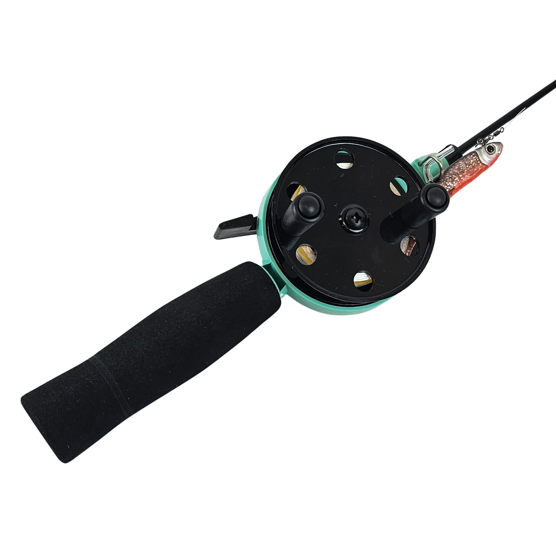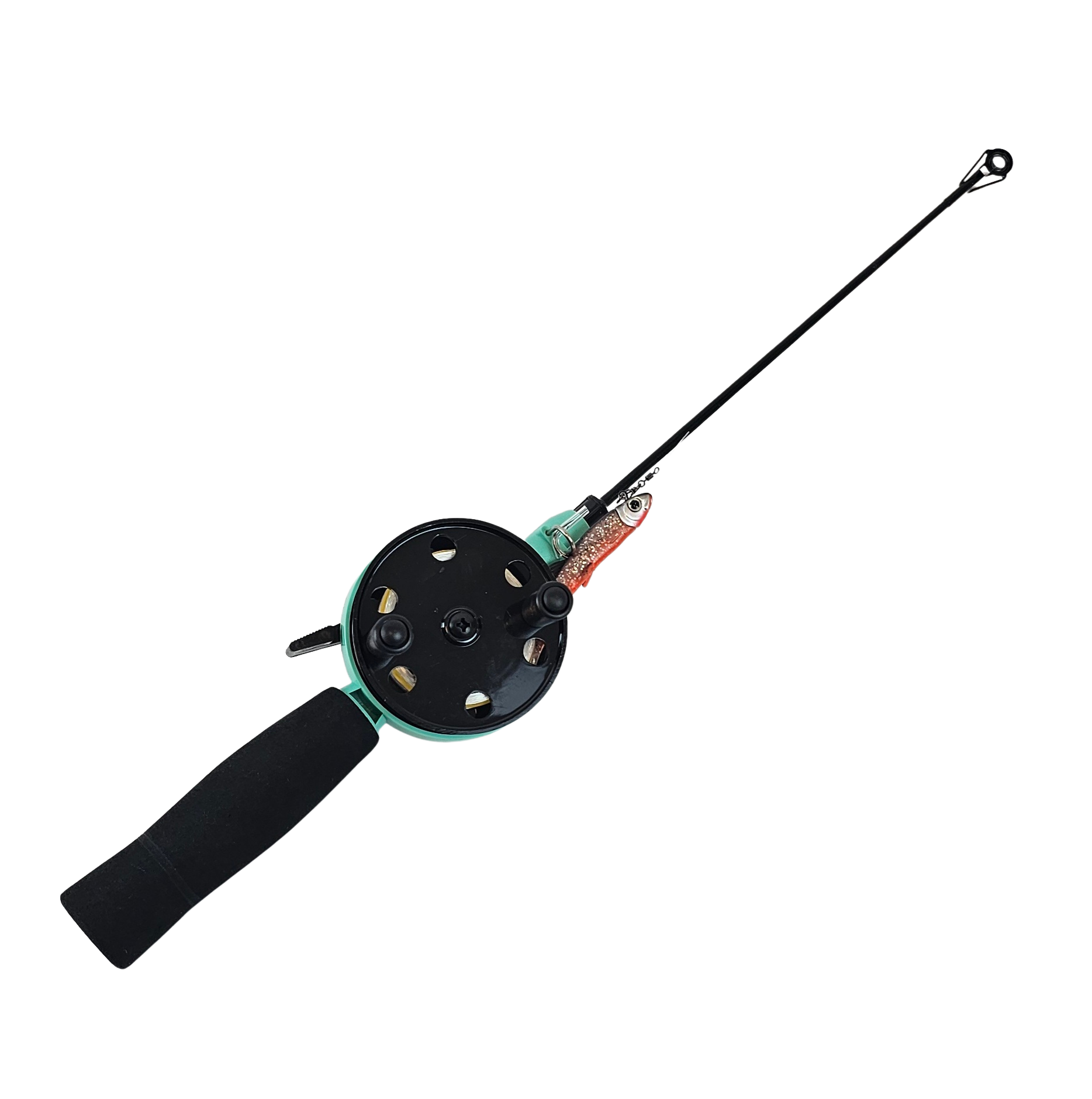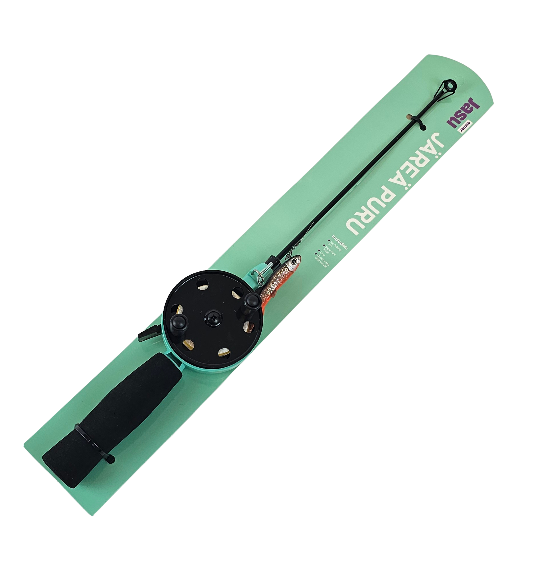 Tää setti o iha paras vähän järeämmille kaloille. Aivan loistava kuhan, jalokalojen ja ison ahvenen pilkintään. Setissä on jämäkkä lasikuituvapa, jolla uitat pilkkiä tehokkaasti ja koukutat kalan helposti. Kela on lukittuva ja vapautuu painamalla vivusta. Kelassa on myös räikkä, joka huutaa isomman kalan viedessä siimaa. Tätä settiä suositellaan, kun kalastat liukupilkin tai pilkkipellin kanssa.