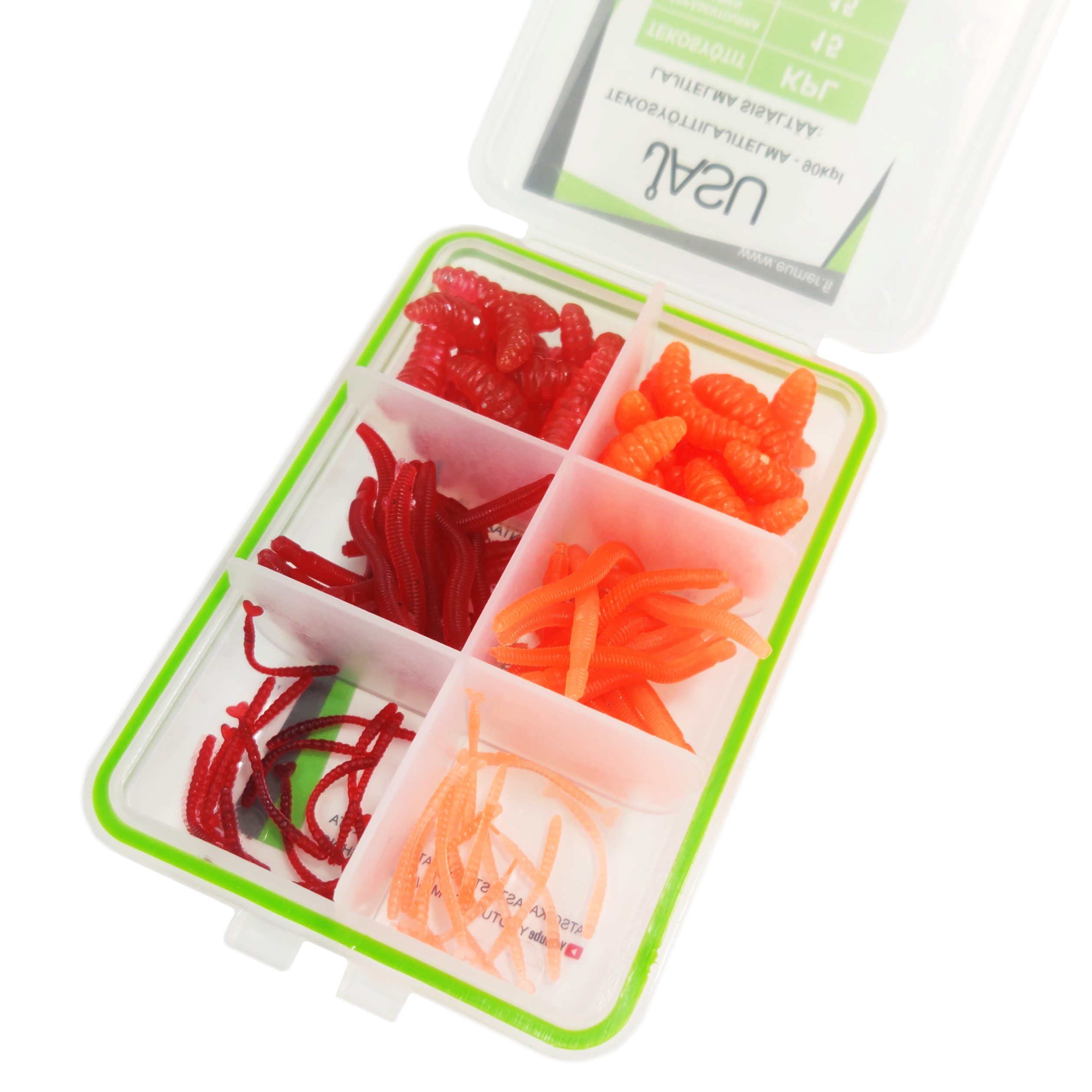 Hei vau!! Nyt on äärimmäisen herkullisen näköinen ja kattava lajitelma. Keinosyöttilajitelman voi pitää aina varalta mukana, jos vaikka aitoja syöttejä ei saakaan tai ne loppuvat kesken. Keinosyötit ovat kalastavia eivätkä kuole kovin helposti. Kukaan ei myöskään kiellä käyttämästä näitä ympäri vuoden, sillä nämä maistuvat kaloille myös avovesikaudella. Setissä on mukana kahta eri väriä ja kolmea eri lajia olevia keinosyöttejä.
