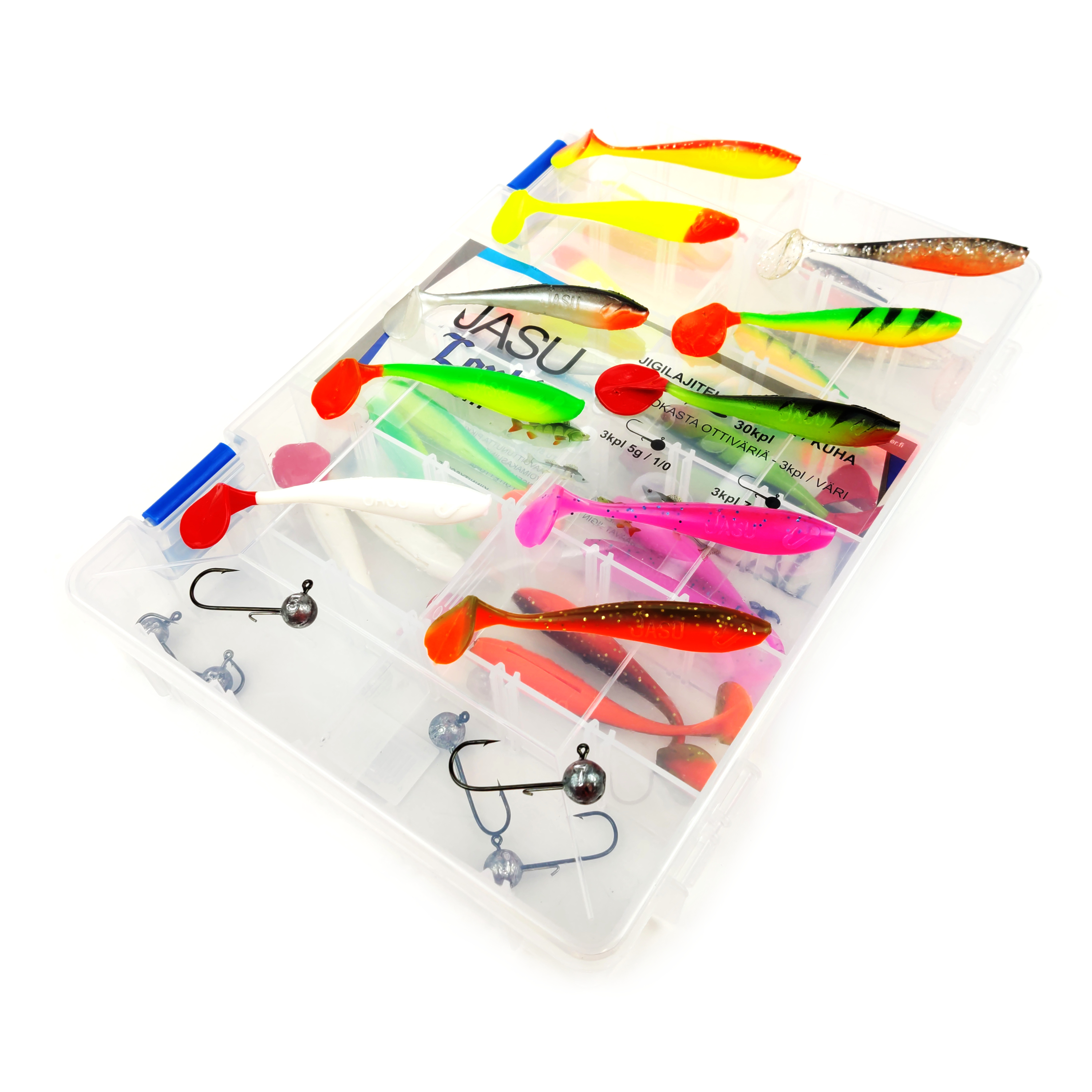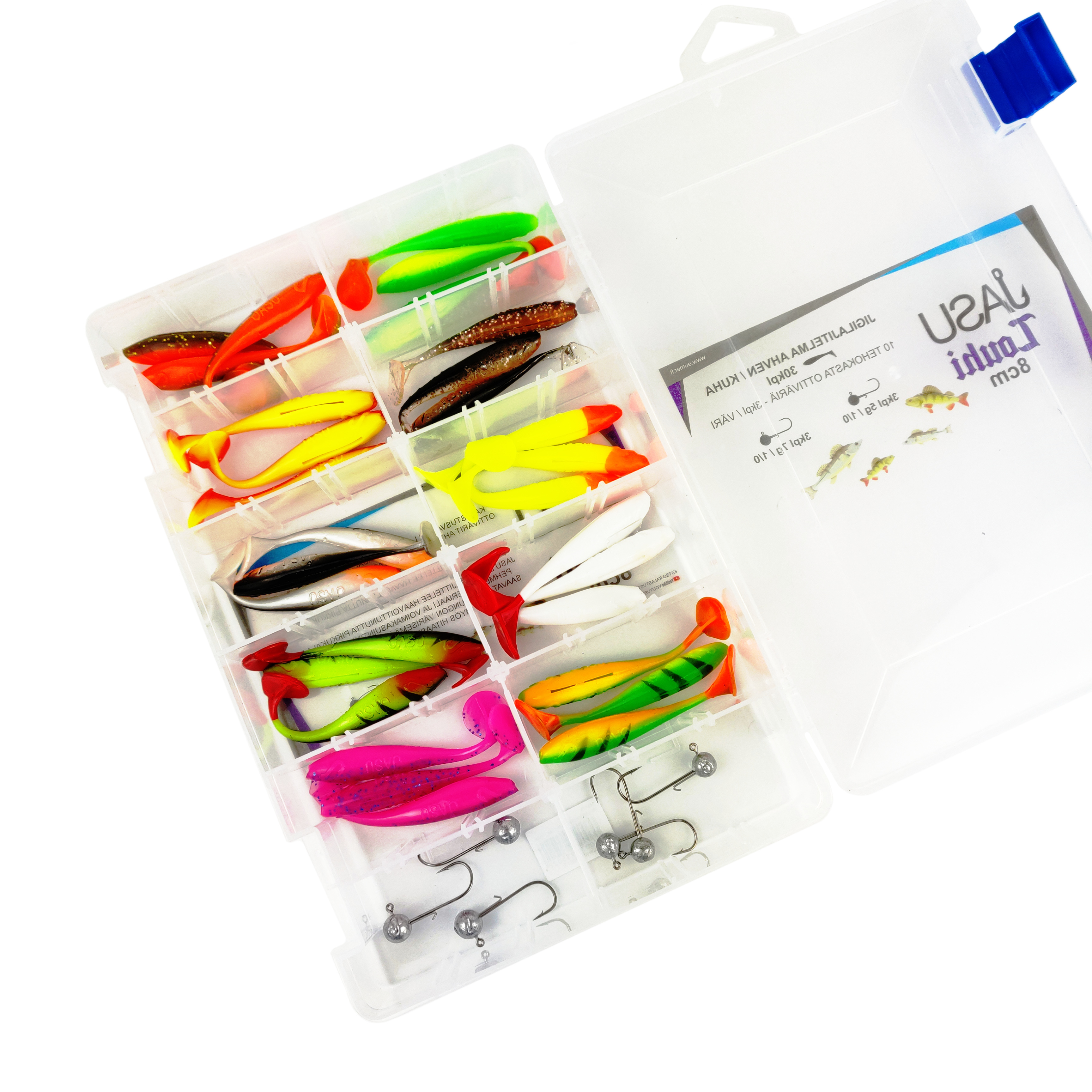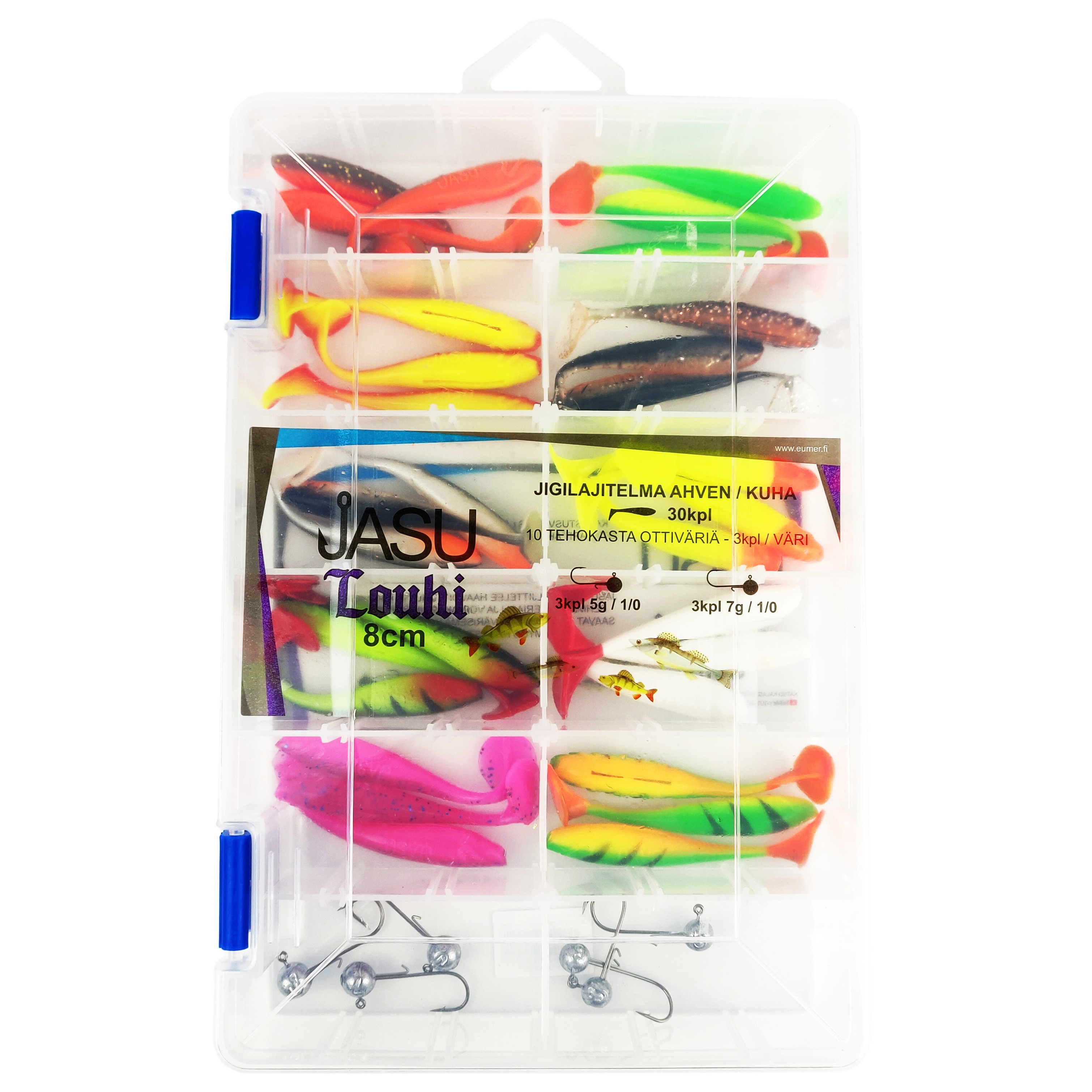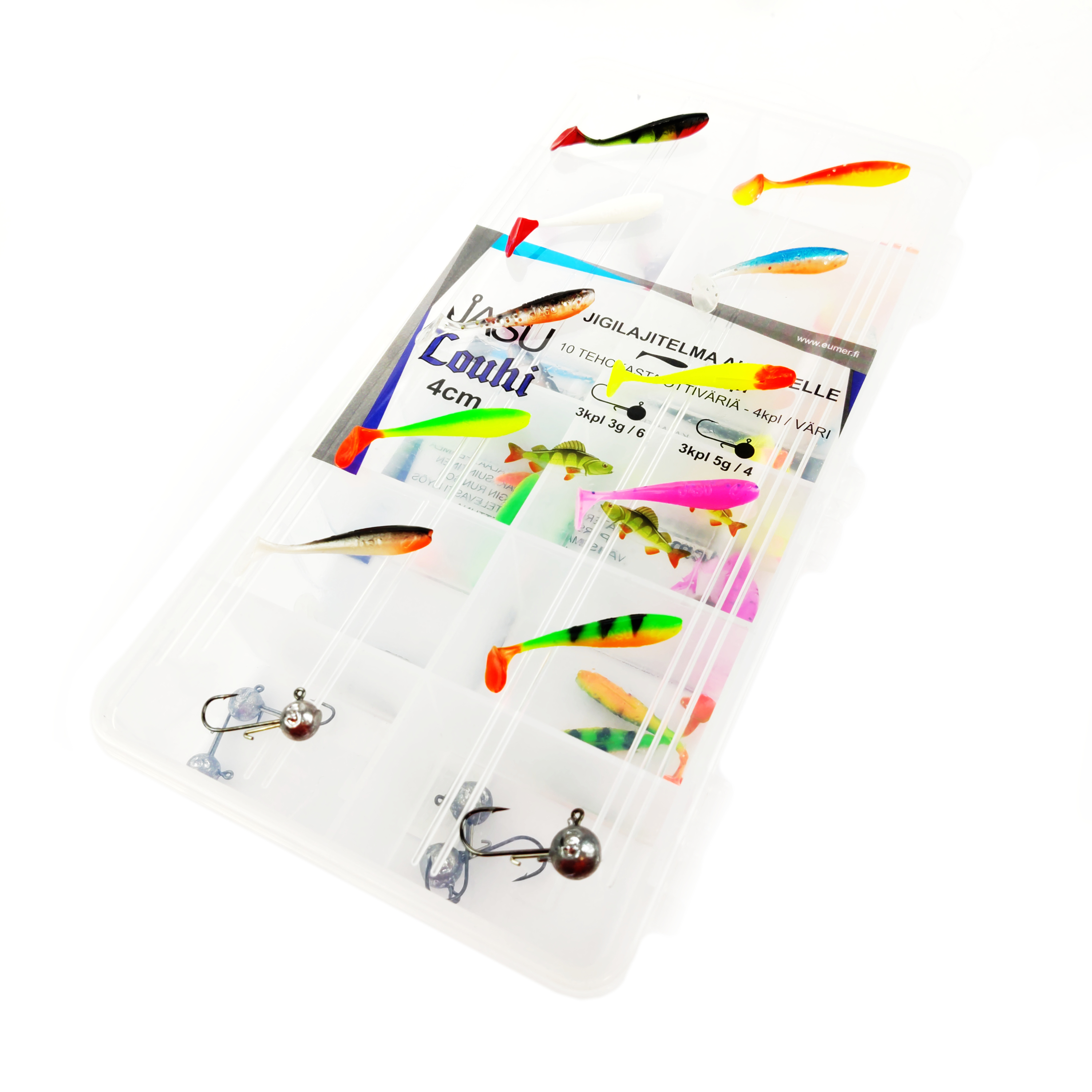 Jasu Louhi jigilajitelmien sisältö on tarkkaan suunniteltu. Niihin on valikoitu aina parhaiten pyytävät värit sekä jigeille juuri oikeankokoiset jigipäät. Jasu Louhen uinti on aivan mieletön! Iso pyrstö luo potkun, joka näkyy koko rungon liikkeenä. Jigi värähtelee tehokkaasti myös aivan hitaasti uitettuna ja houkuttelee saalista kauempaakin. Tarpeita on hyvin erilaisia ja niinpä myös lajitelistamme löytyy useita eri kokovaihtoehtoja. Tästä vain valitsemaan se juuri sinulle sopivin.