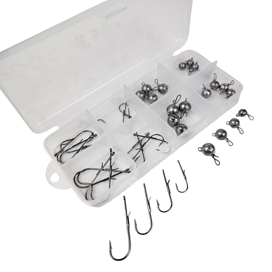 Lajitelma sisältää 20 kappaletta pikajigipäitä neljässä eri koossa sekä 20 kpl pikajigikoukkuja neljässä eri koossa.