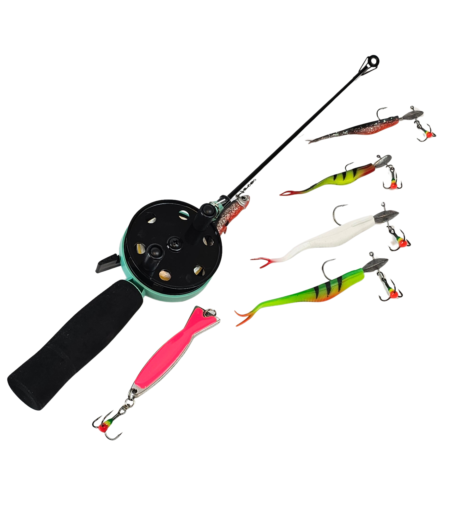 Tää setti o iha paras vähän järeämmille kaloille. Aivan loistava kuhan, jalokalojen ja ison ahvenen pilkintään. Setissä on jämäkkä lasikuituvapa, jolla uitat pilkkiä tehokkaasti ja koukutat kalan helposti. Kela on lukittuva ja vapautuu painamalla vivusta. Kelassa on myös räikkä, joka huutaa isomman kalan viedessä siimaa. Tätä settiä suositellaan, kun kalastat liukupilkin tai pilkkipellin kanssa. Lisättiin vielä settiin tosi tehokkaita jigipilkkejä sekä maukas pystypilkki! Kireitä siimoja!