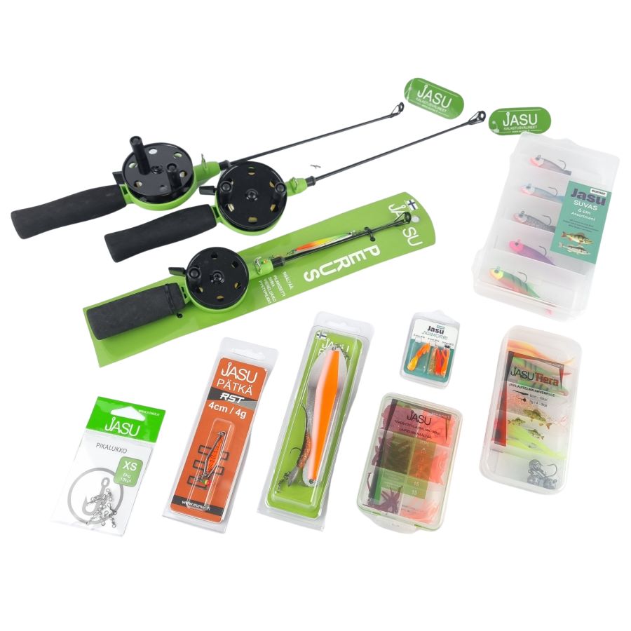 Me yritetään kaikin tavoin helpottaa kalastusvälineiden hankintaa ja kalalle lähtöä. Juurikin siitä syystä on nyt tehty tällaisia kaikenkattavia pilkkipaketteja. Tämä Perus -pilkkisetti on mainio peli ahvenen kalastukseen. Jos sun pitää pärjätä vain yhdellä setillä, ni se o täsä. Tällä setillä onnistuu niin ahvenen, siian, särkikalojen kuin "sattuma" kuhankin pilkintä. Setissä on jämäkkä lasikuituvapa, jolla uitat pilkkiä tehokkaasti ja koukutat kalan helposti. Kela on lukittuva ja vapautuu painamalla vivusta. Lisäksi tässä setissä tulee mukana tarvikkeet vaikka parille kaverillekin tai voit halutessasi kasata kolme valmista settiä, jolloin vaihto käy tarvittaessa lennosta. Joskus tarvitaan niitä nopeita liikkeitä pilkkireissullakin. Ja kai tätä voisi kutsua vaikka perhepaketiksikin. Ihan parasta puuhaa perheen kanssa lähteä nauttimaan ulkoilusta mukavaan talvisäähän ja hankkia samalla terveellistä lähiruokaa.