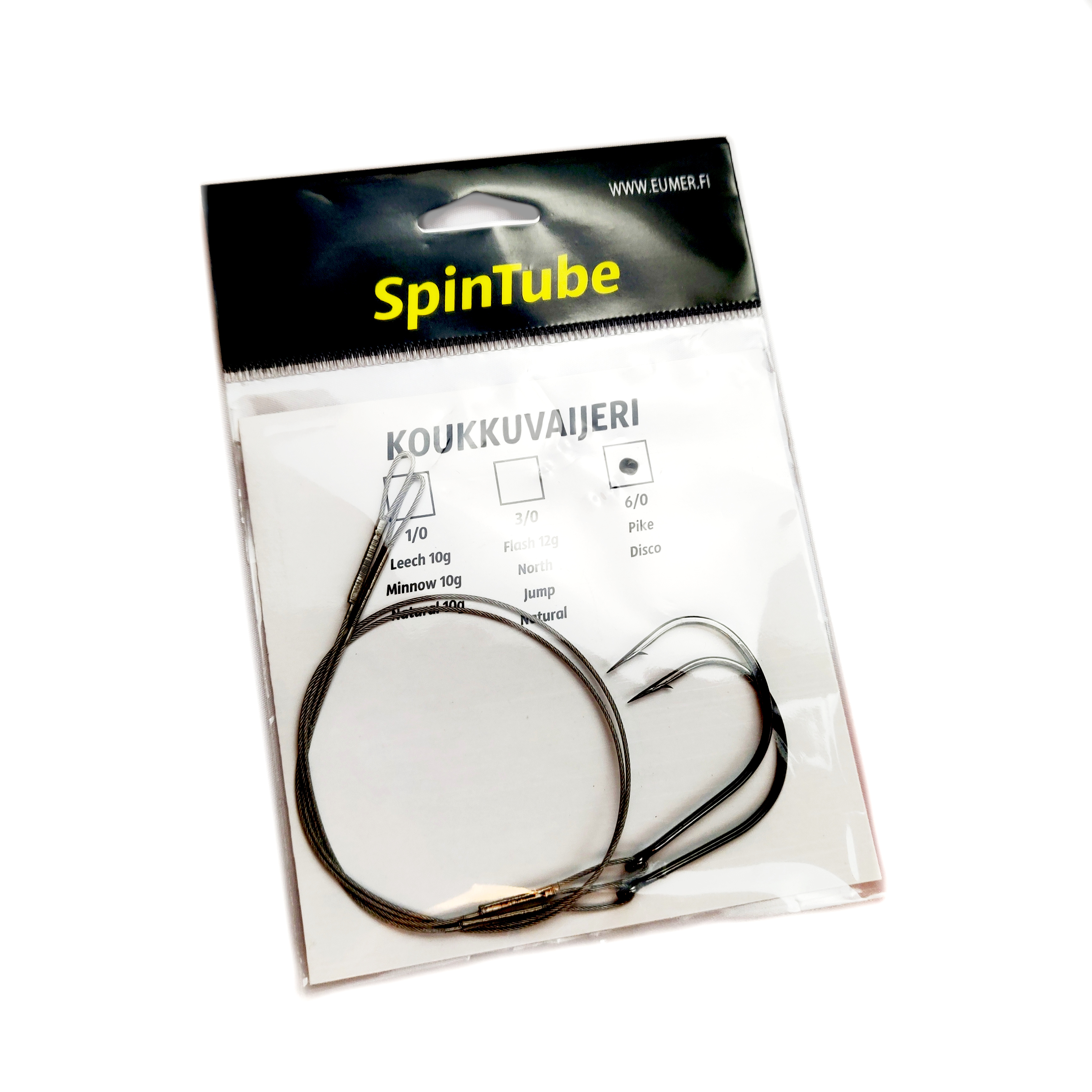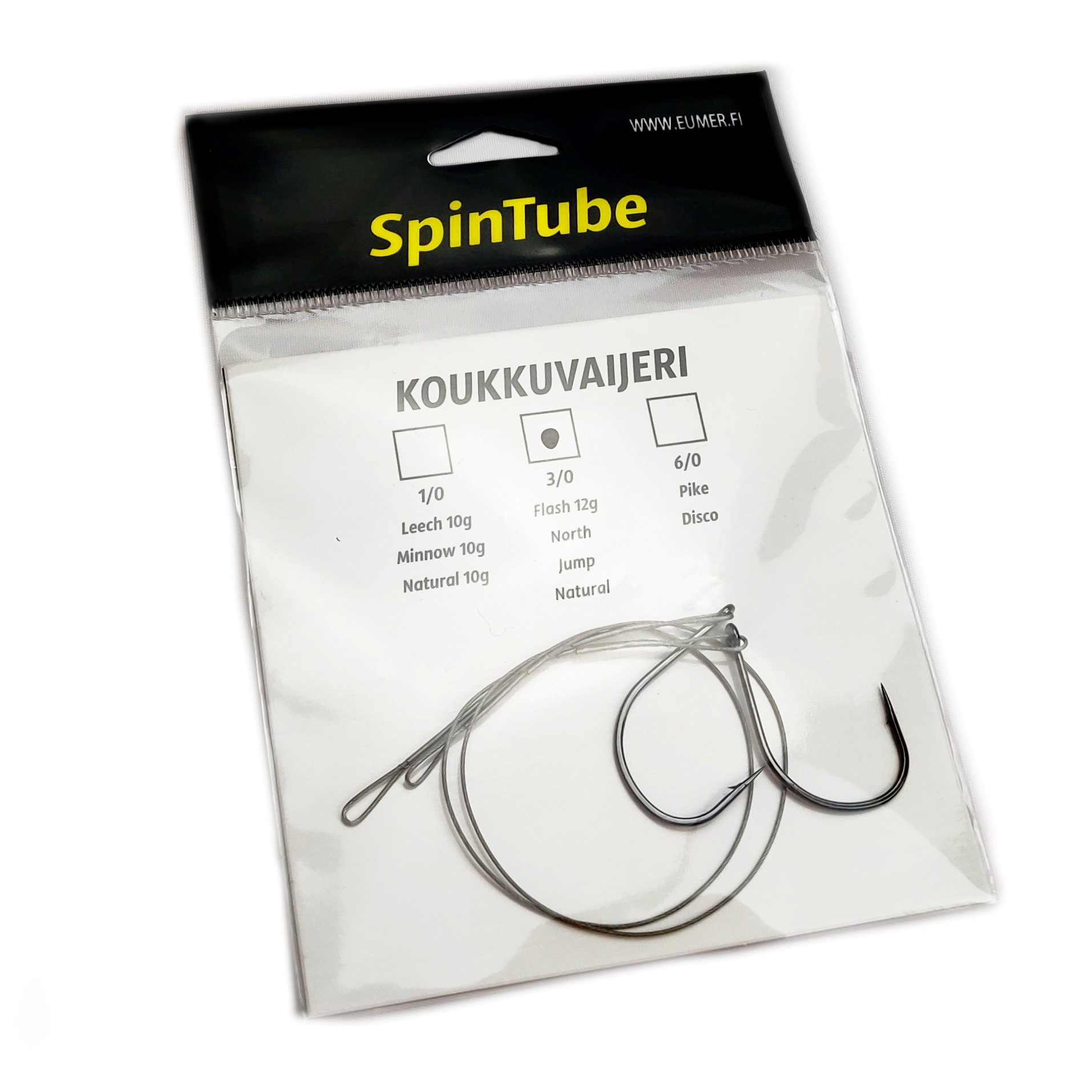 Spintube Koukkuvaijeri on heittoperhoihin suunniteltu peruke. Peruke on notkea ja kestävä ja se suojelee heittoperhoasi hauen teräviltä hampailta. Vaijeri on erittäin helppo asentaa heittoperhoon kiinni. Heittoperho liukuu vaijerilla, mikä vähentää kalojen karkuutuksia ja perhon vaurioitumista. Koukut ovat isokitaisia, eivätkä näin ollen jää niin helposti kasvustoon kiinni. Yksihaarakoukusta saat myös kalan irrotettu helpommin.