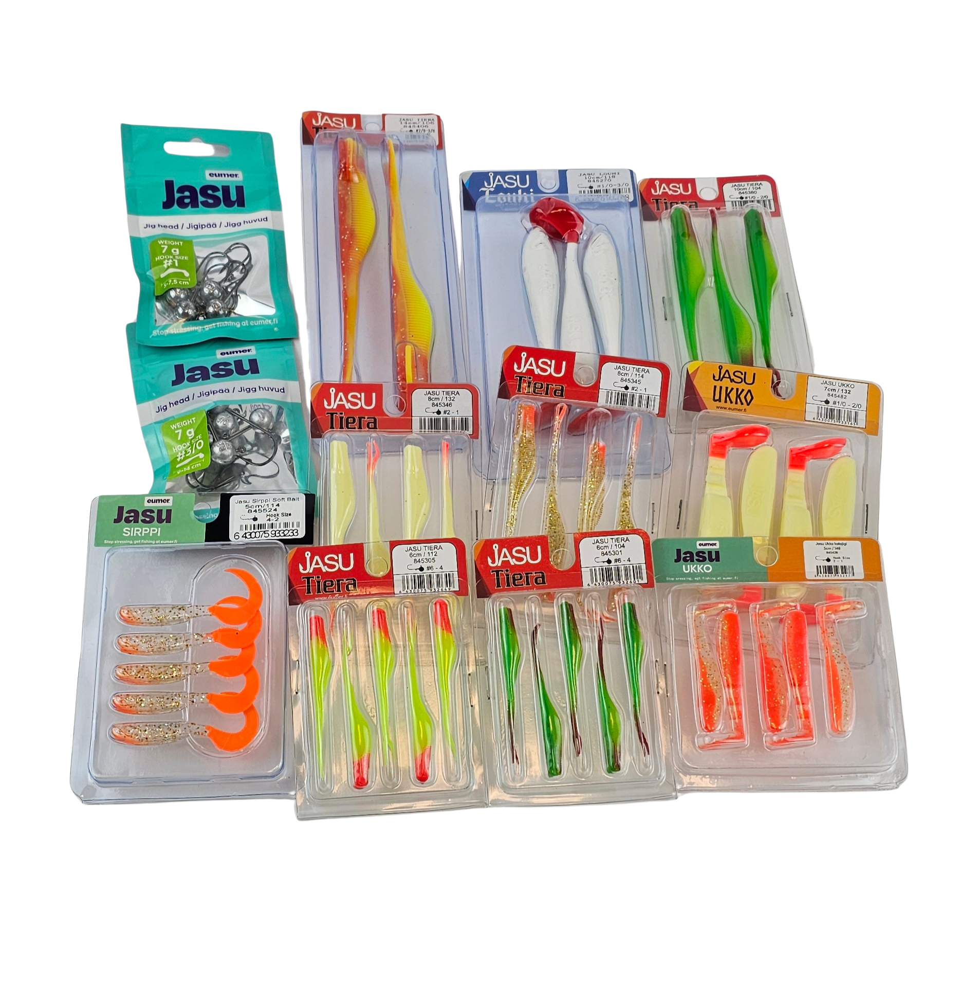 Nåväl nu är det! Ett helt obegripligt set jiggar för abborre och gös och till vilket pris... Setet innehåller jiggar i olika längder och färger, som du kan använda för att komplettera ditt fiskeredskap, eller med detta set får du ett fungerande startpaket för att börja jigga . Setet innehåller olika modeller av Jasu jigfamiljen, inklusive Sirppi, Louhi och Ukko jiggar. Dessutom innehåller setet två påsar med jigghuvuden, så du kan testa jiggarna så fort paketet kommer.